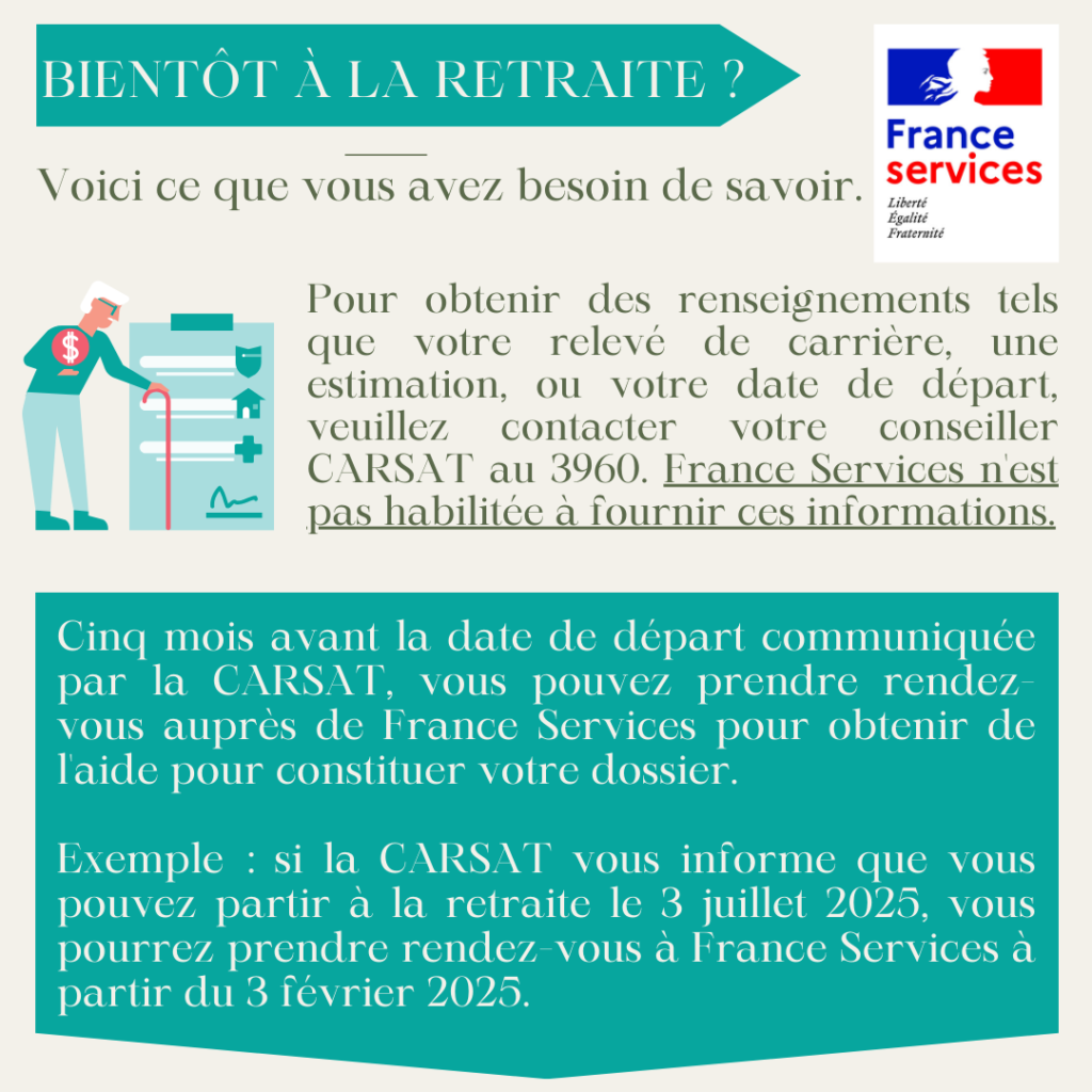 Pour obtenir des renseignements tels que votre relevé de carrière, une estimation, ou votre date de départ, veuillez contacter votre conseiller CARSAT au 3960. France Services n'est pas habilitée à fournir ces informations.