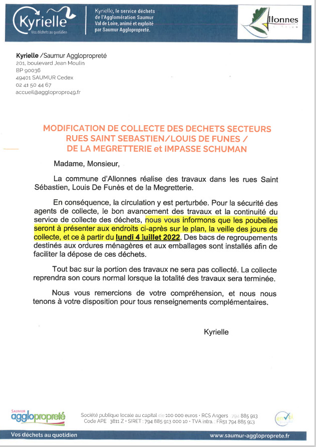 La collecte des déchets réalisée par Kyrielle est modifiée.