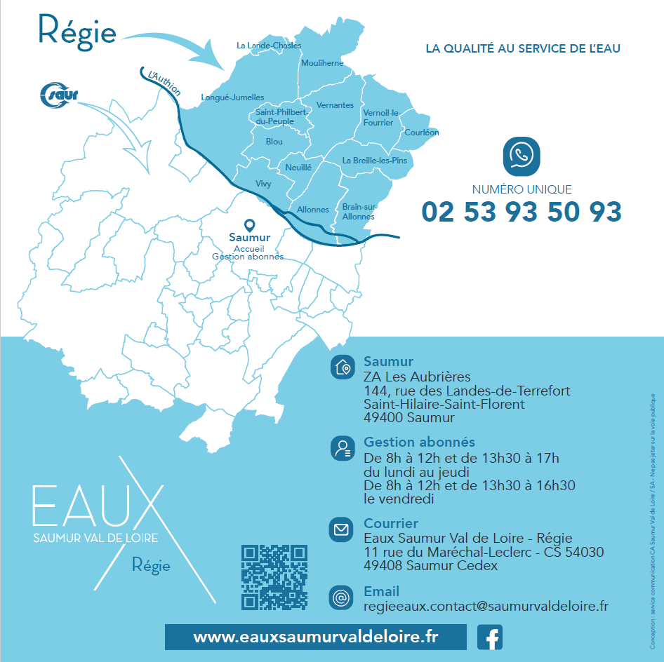 Pour tout renseignements complémentaires, vous pouvez vous adresser à la régie eaux Saumur val de Loire au 02 53 93 50 93.