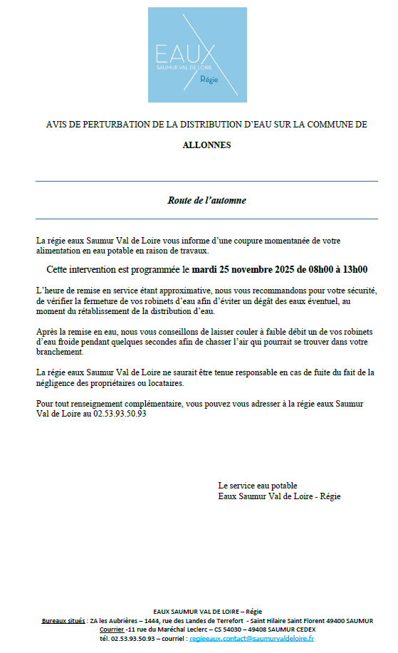 La régie eaux Saumur val de Loire vous informe d'une coupure momentanée de l'alimentation en eau potable, route de l'Automne, en raison de travaux. Cette intervention est programmée le 25/11/2025 de 08h00 à 13h00