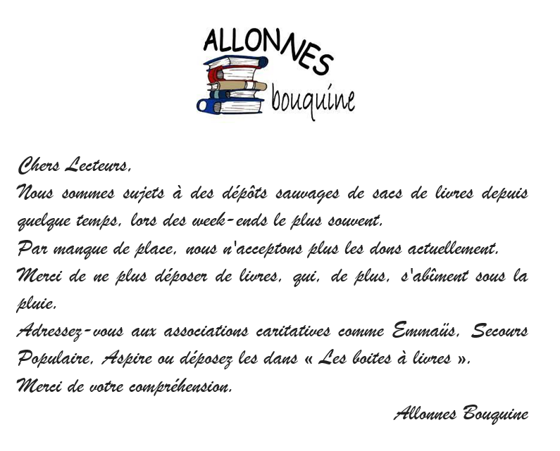 - Nous sommes sujets à des dépôts sauvages de sacs de livres depuis quelque temps, lors des week-ends le plus souvent. Par manque de place, nous n'acceptons plus les dons actuellement. Merci de ne plus déposer de livres, qui, de plus, s'abîment sous la pluie. Adressez-vous aux associations caritatives comme Emmaüs, Secours Populaire, Aspire ou déposez les dans « Les boites à livres ». Merci de votre compréhension.