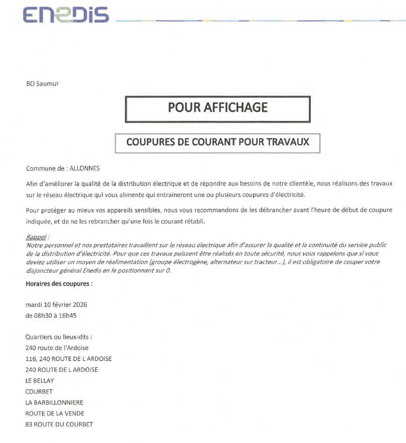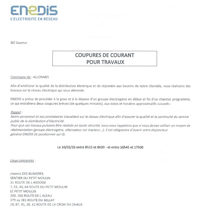 - Enedis vous informe d’une coupure d’électricité programmé le 10/02/2026