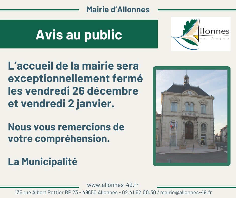 Chères Allonnaises, chers Allonnais, Nous vous informons que la mairie sera exceptionnellement fermée le vendredi 26 décembre ainsi que le vendredi 2 janvier. Nous vous remercions pour votre compréhension et restons à votre disposition pour toute démarche avant ou après ces dates. En cette période de fêtes, le Conseil municipal et l’ensemble des agents communaux souhaitent vous adresser leurs vœux les plus sincères et les plus chaleureux. Que ces jours de fin d’année soient pour chacune et chacun d’entre vous l’occasion de vivre de beaux moments de partage, de joie et de sérénité entourés de vos proches. Puissent les fêtes illuminer votre quotidien et annoncer une nouvelle année empreinte de bonheur, d’élan et de réussite. Prenez soin de vous, et très belles fêtes de fin d’année à toutes et à tous !