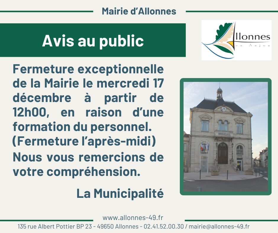 - Fermeture de la mairie le mercredi 17 décembre après-midi