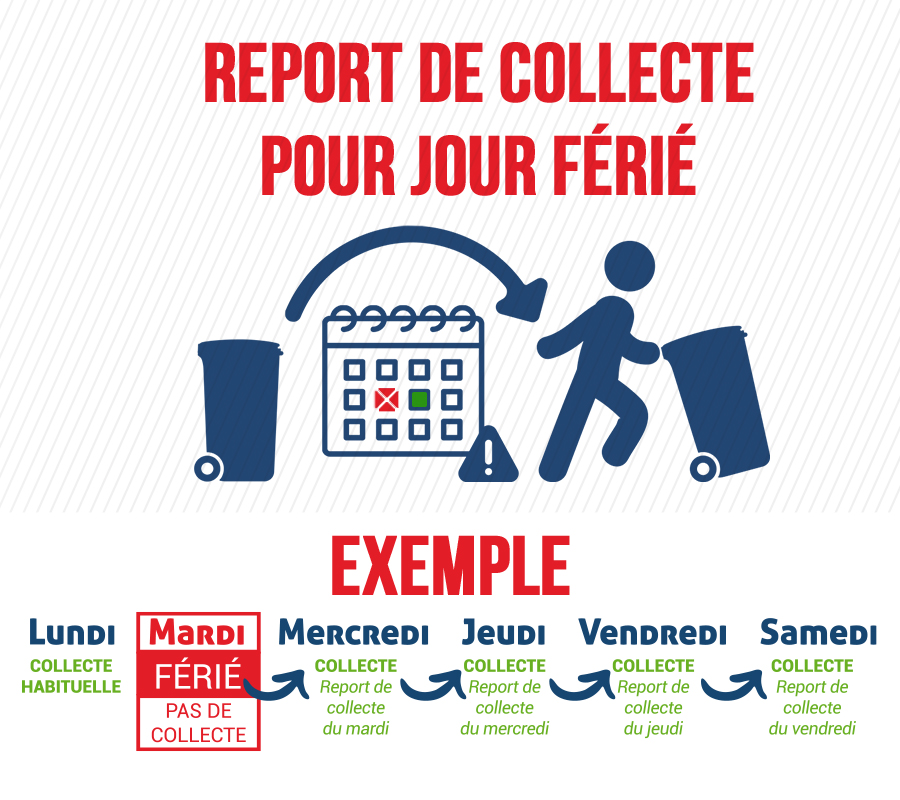 Lundi 1 mai étant férié, toutes les collectes des bacs sont décalées d’une journée à partir du jour férié, et cela jusqu’au samedi.