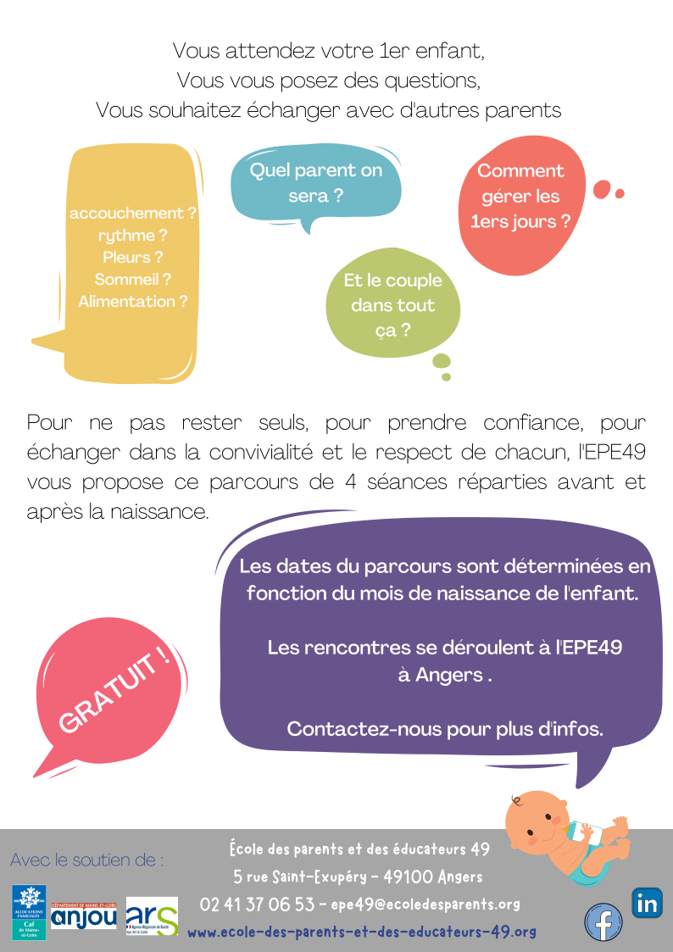 • Il s’agit de 4 séances, dont 2 avant la naissance, pour échanger avec d’autres parents sur l’arrivée du bébé et le devenir parent : c’est quoi être parent ? Qu’est-ce qui va changer ? Et l’arrivée du bébé ? Et ensuite ? Des professionnels accompagnent les parents dans un échange bienveillant, sans jugement, dans le cadre convivial de la maison des familles, 5 rue St-Exupéry à Angers. Ce parcours s’adresse aux futurs-pères comme aux futurs-mères sans conditions si ce n’est qu’il s’agit de la 1ère grossesse.
