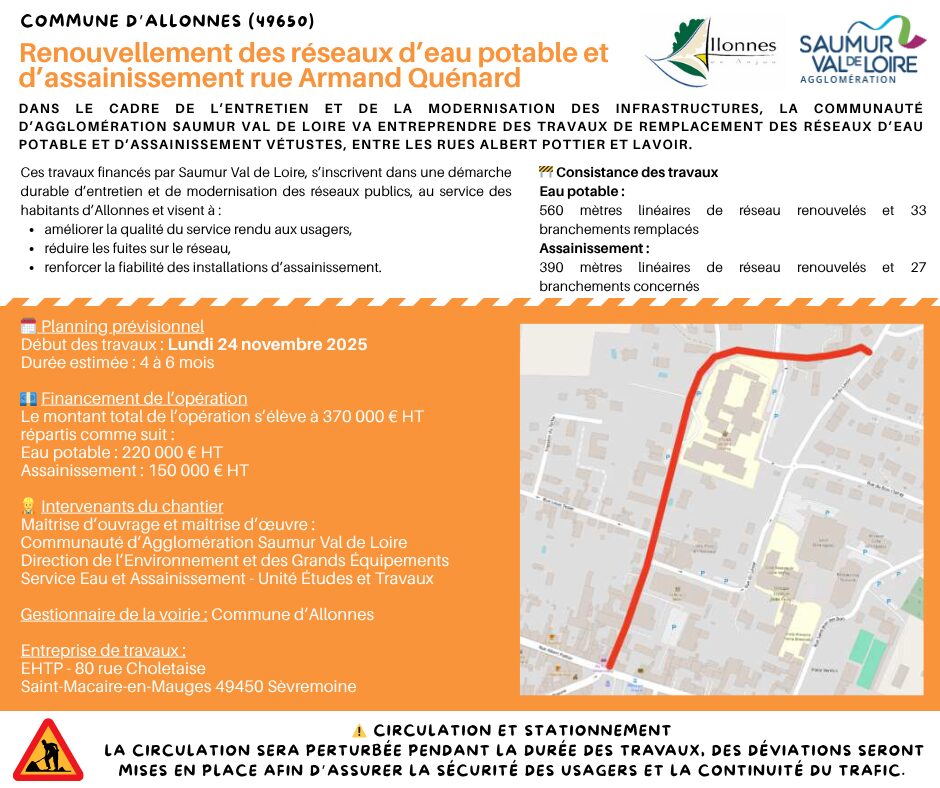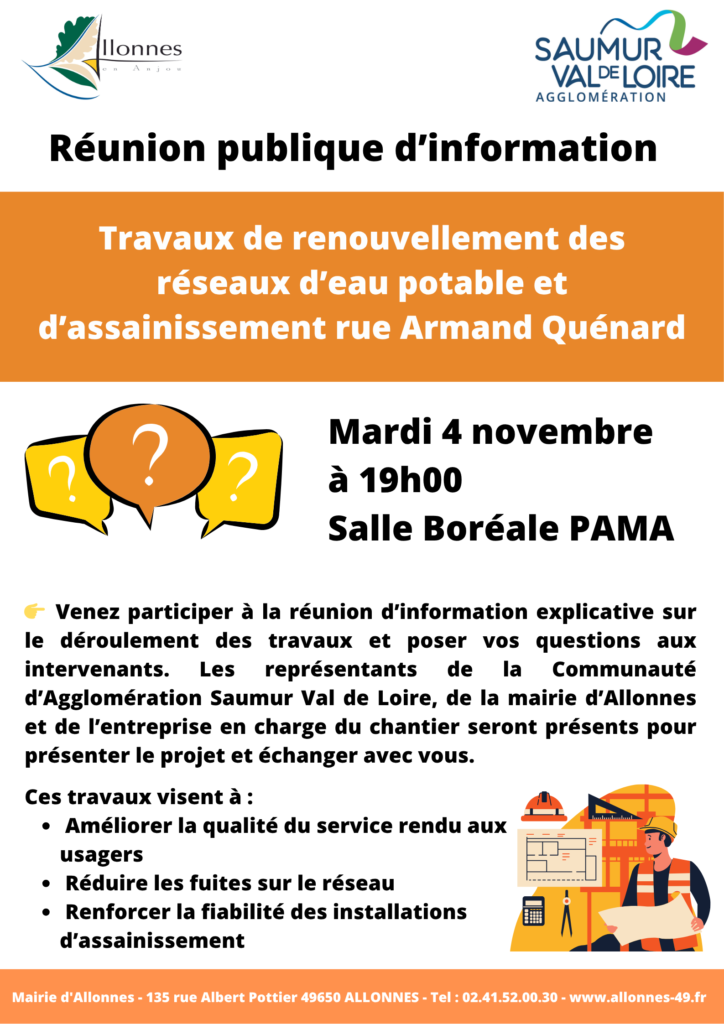 👉 Venez participer à la réunion d’information explicative sur le déroulement des travaux et poser vos questions aux intervenants. Les représentants de la Communauté d’Agglomération Saumur Val de Loire, de la mairie d’Allonnes et de l’entreprise en charge du chantier seront présents pour présenter le projet et échanger avec vous : mardi 4 novembre à 19h00 salle Boréale