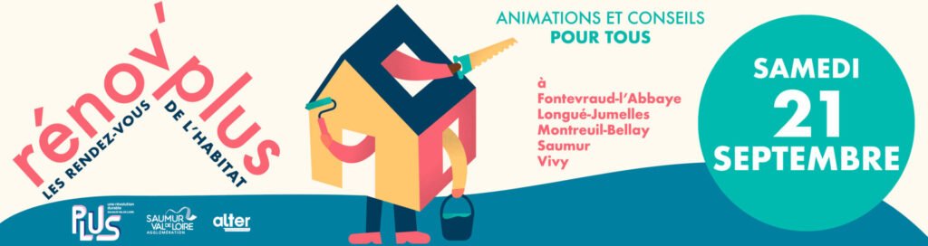 Rénov'Plus, les rendez-vous de l'habitat reviennent le samedi 21 septembre 2024 pour une 3ème édition. Plusieurs animations vous seront proposées gratuitement dans 5 communes de l’Agglomération : à Fontevraud-l’Abbaye, Longué-Jumelles, Montreuil-Bellay, Saumur et Vivy. Ces rendez-vous seront une nouvelle occasion d’en savoir plus sur le dispositif d'aides à l'amélioration de l'habitat (OPAH-Ru), porté par l’Agglomération Saumur Val de Loire et animé par l’opérateur Alter.
