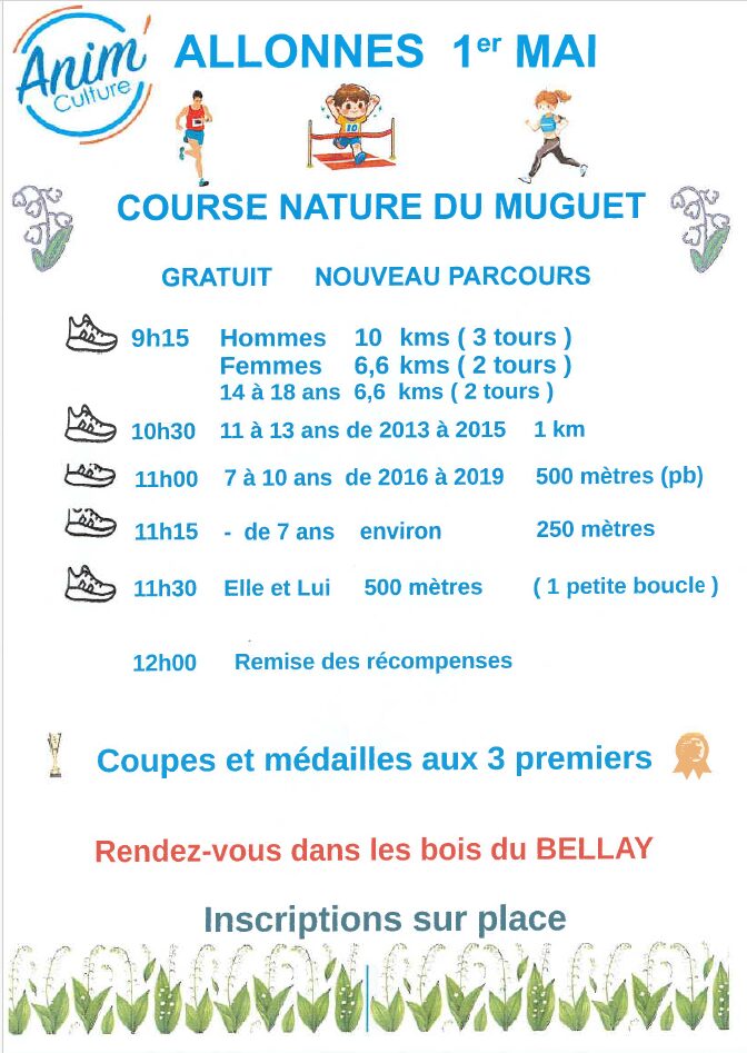 👨‍👩‍👧‍👦 Cross du 1 mai : Petits, grands, tous au départ ! 🌿 Le 1er mai, rendez-vous dans les bois du Bellay pour la Course Nature du Muguet, organisée par Anim Culture. Un événement gratuit, en pleine nature, avec un nouveau parcours, pensé pour que chacun puisse participer : enfants, ados, adultes, en solo ou en duo… il y a une course pour tout le monde ! 👟 Au programme de la matinée :