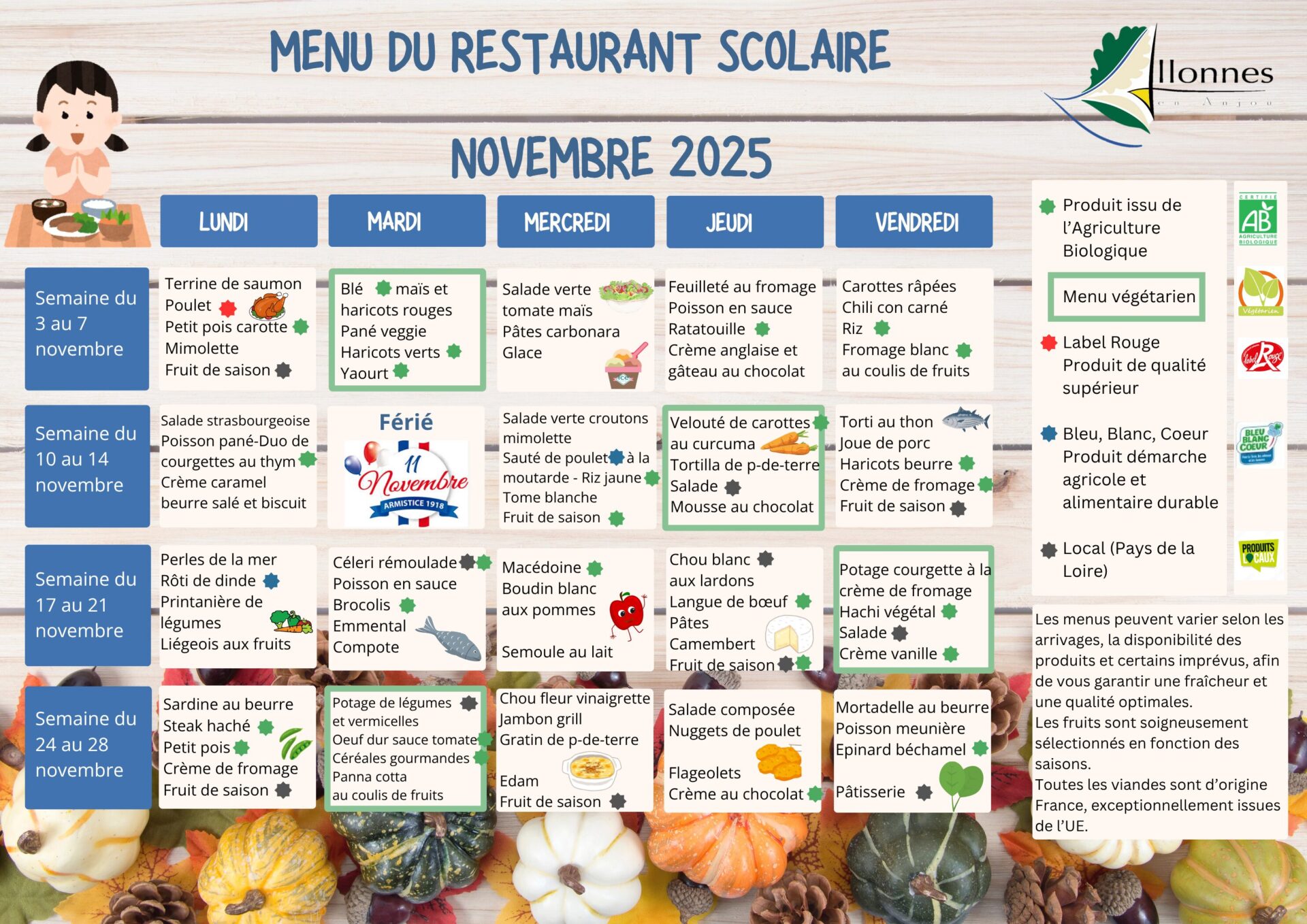 Pendant les périodes scolaires, y sont servis chaque jour les repas destinés aux élèves des écoles publique et privée allonnaises, ainsi que les repas du multi-accueil « Graines d’Eveil ».