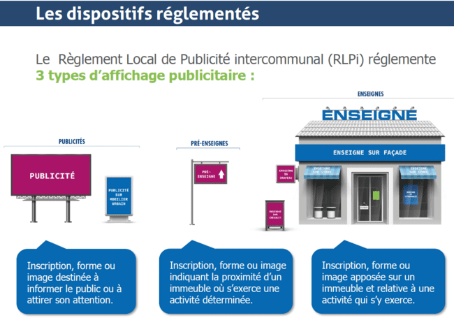 La réglementation nationale peut être renforcée à l’échelle locale par un Règlement Local de Publicité intercommunal (RLPi) plus restrictif élaboré par les établissements publics de coopération intercommunale sur l’intégralité de leurs territoires.