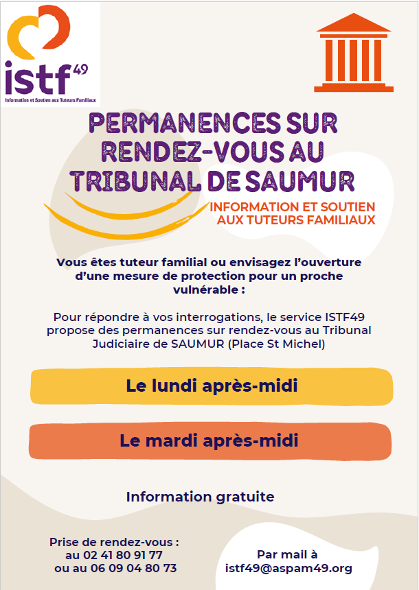 Pour répondre à ces questions, une juriste du service ISTF 49 reçoit gratuitement, sur rendez-vous, les lundi et mardi après-midi au sein du Tribunal Judiciaire de SAUMUR.